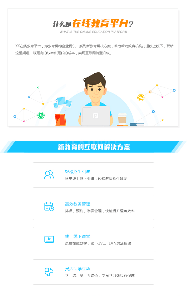 XK在线教育平台,为教育机构企业提供一系列新教育解决方案,着力帮助教育机构打通线上线下,联结流量渠道,以更高的效率和更低的成本,实现互联网转型升级。